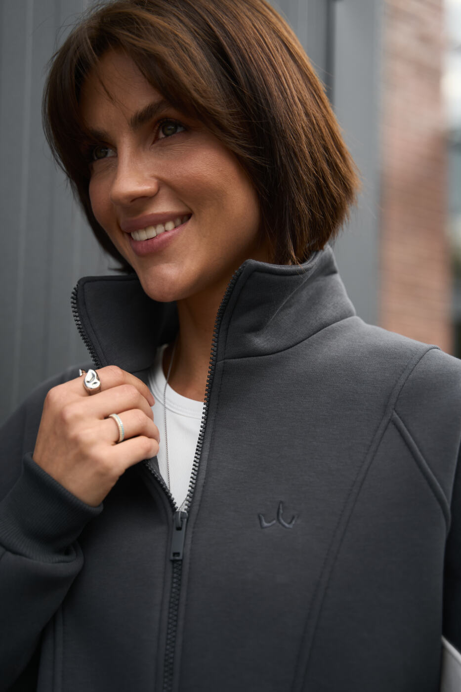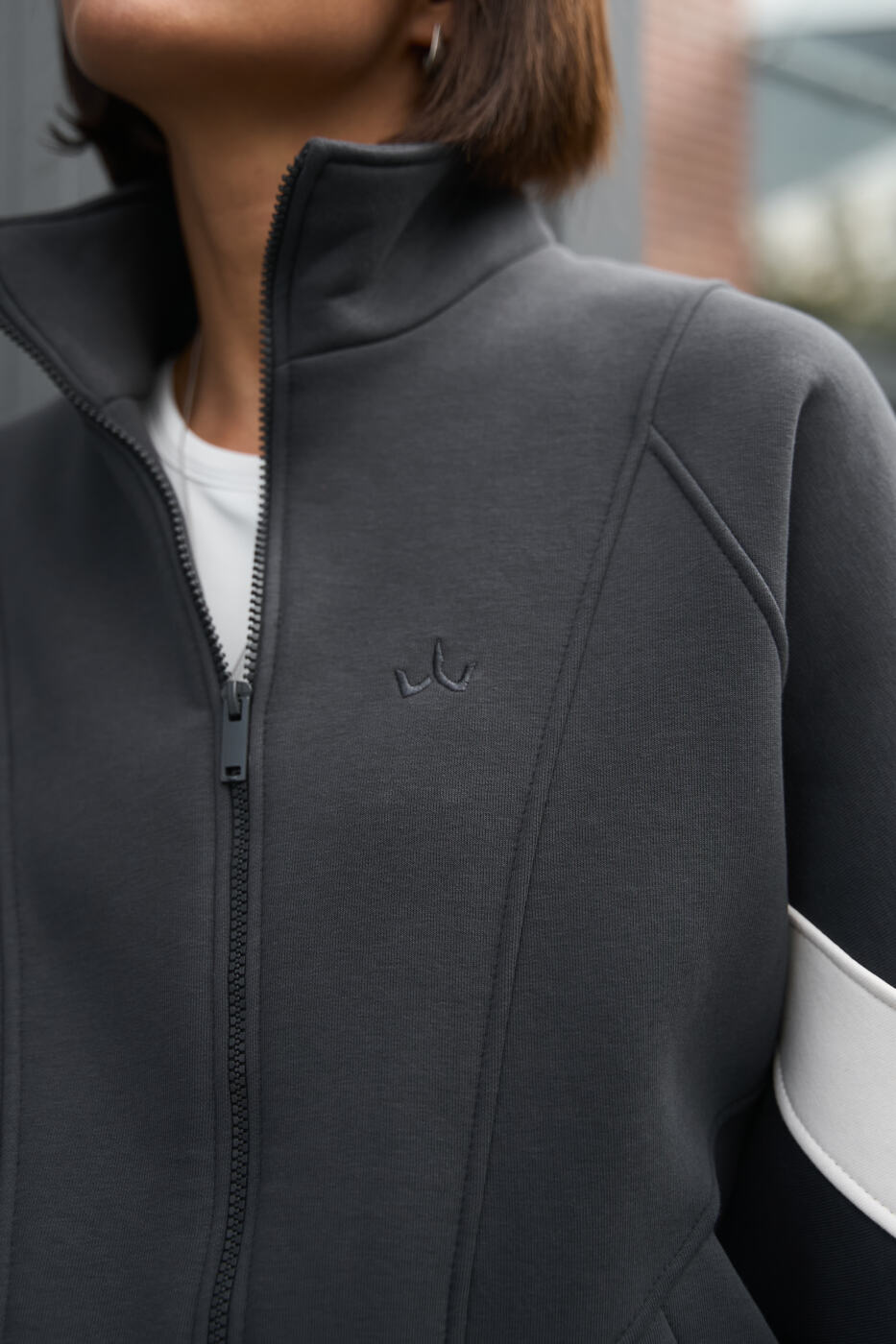 Худі близький до OVERSIZE зі стойкою на блискавці, має зручні манжети з кашкорсе, опущене плече, є бічні кишені та акцентний лампас по ширині кофти