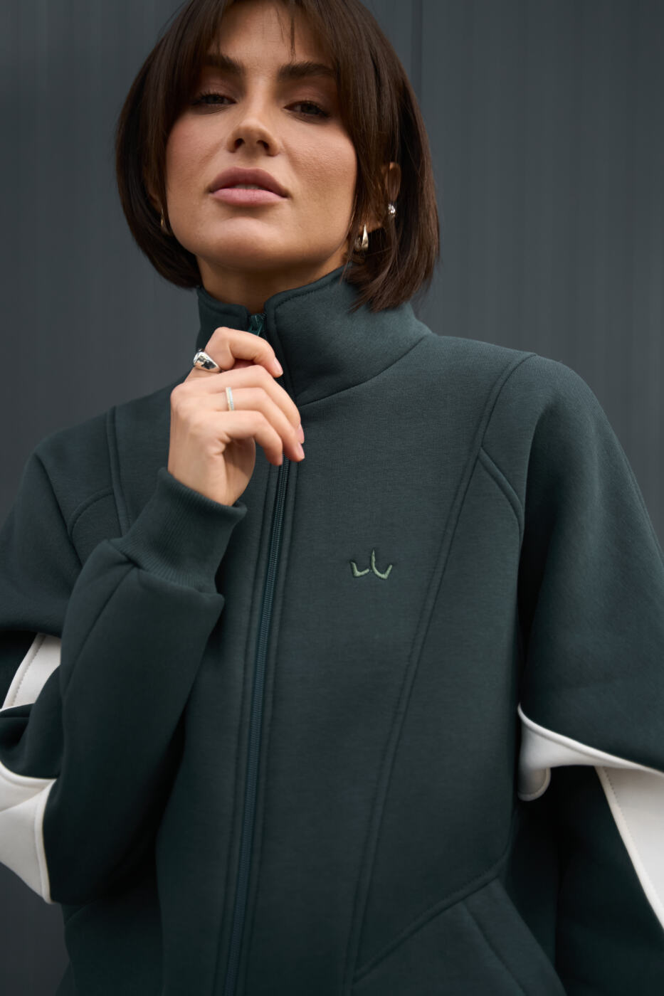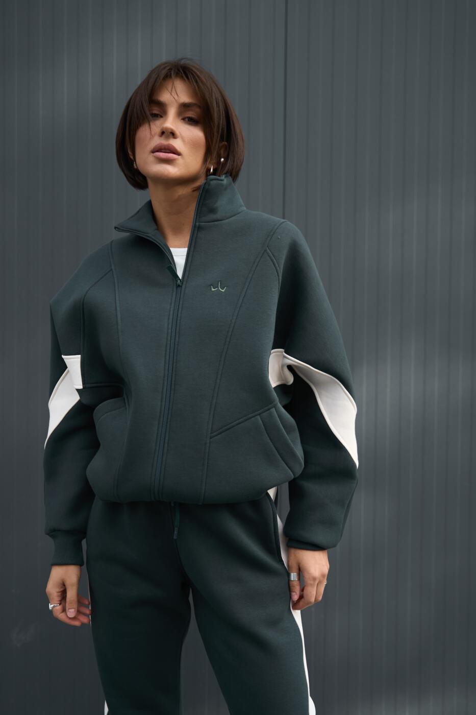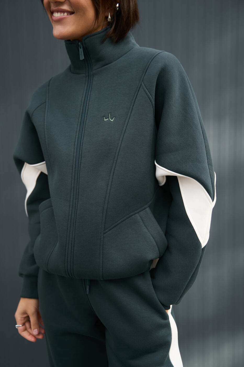 Худі близький до OVERSIZE зі стойкою на блискавці, має зручні манжети з кашкорсе, опущене плече, є бічні кишені та акцентний лампас по ширині кофти