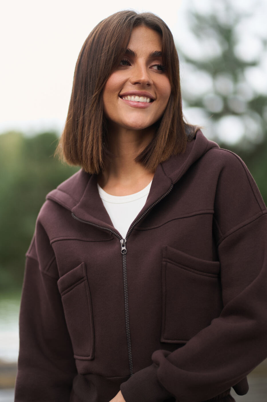 Худі з подвійним капюшоном вільного крою, є бічні кишені по переду, еластичні манжети на рукавах, по низу також рібана